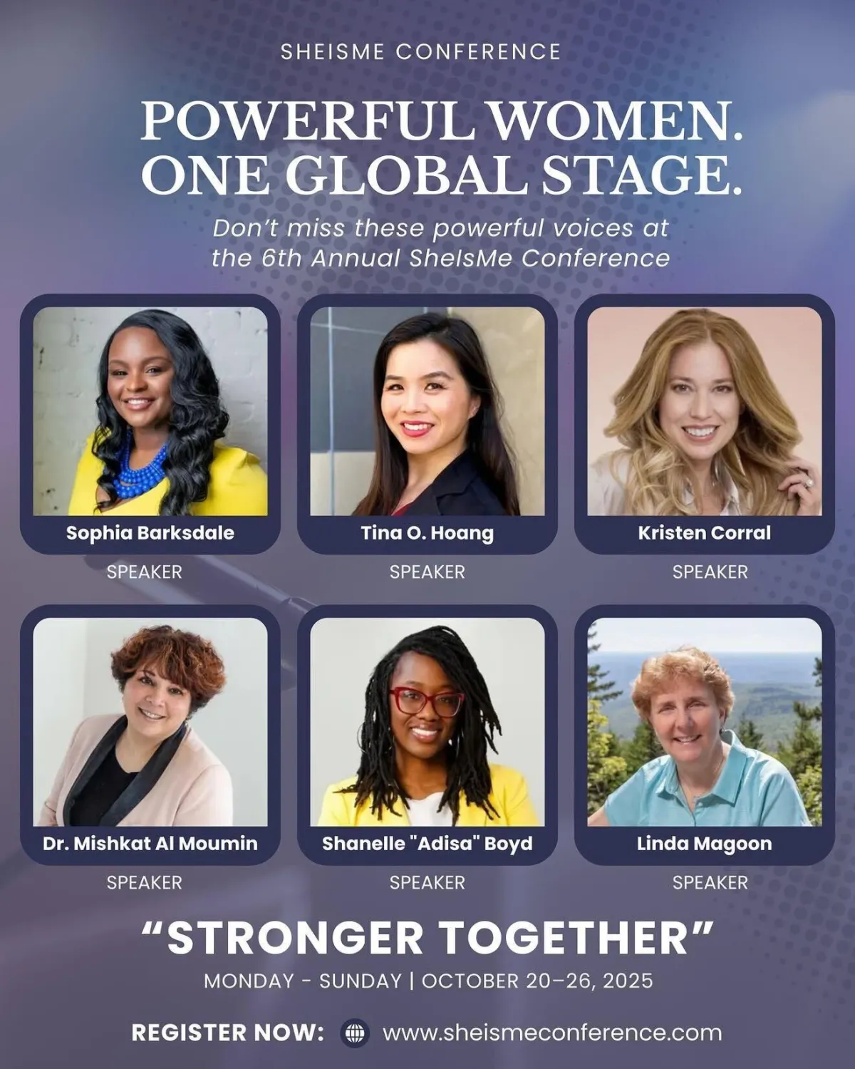 I am beyond honored to announce that I’ll be speaking at the 6th Annual SheIsMeConference, happening October 21–26, 2025. This global conference brings togetherwomen from around the world for six days of powerful panels, transformative workshops, inspiring speakers, and meaningful conversations.